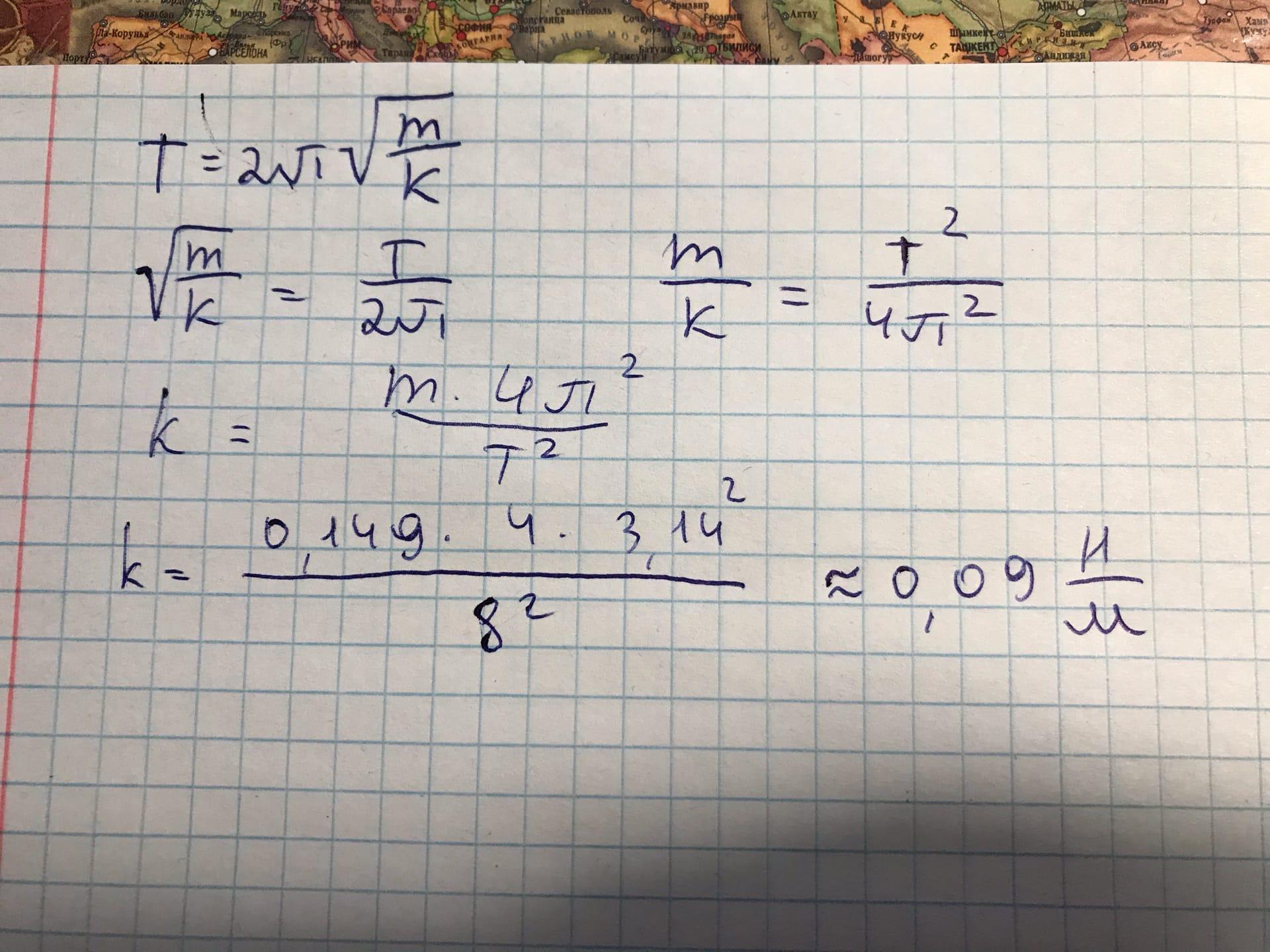 Период колебаний груза массой 149 г на пружине равен 8 с. Определи жёсткость пружины. При расчётах прими π=3,14.