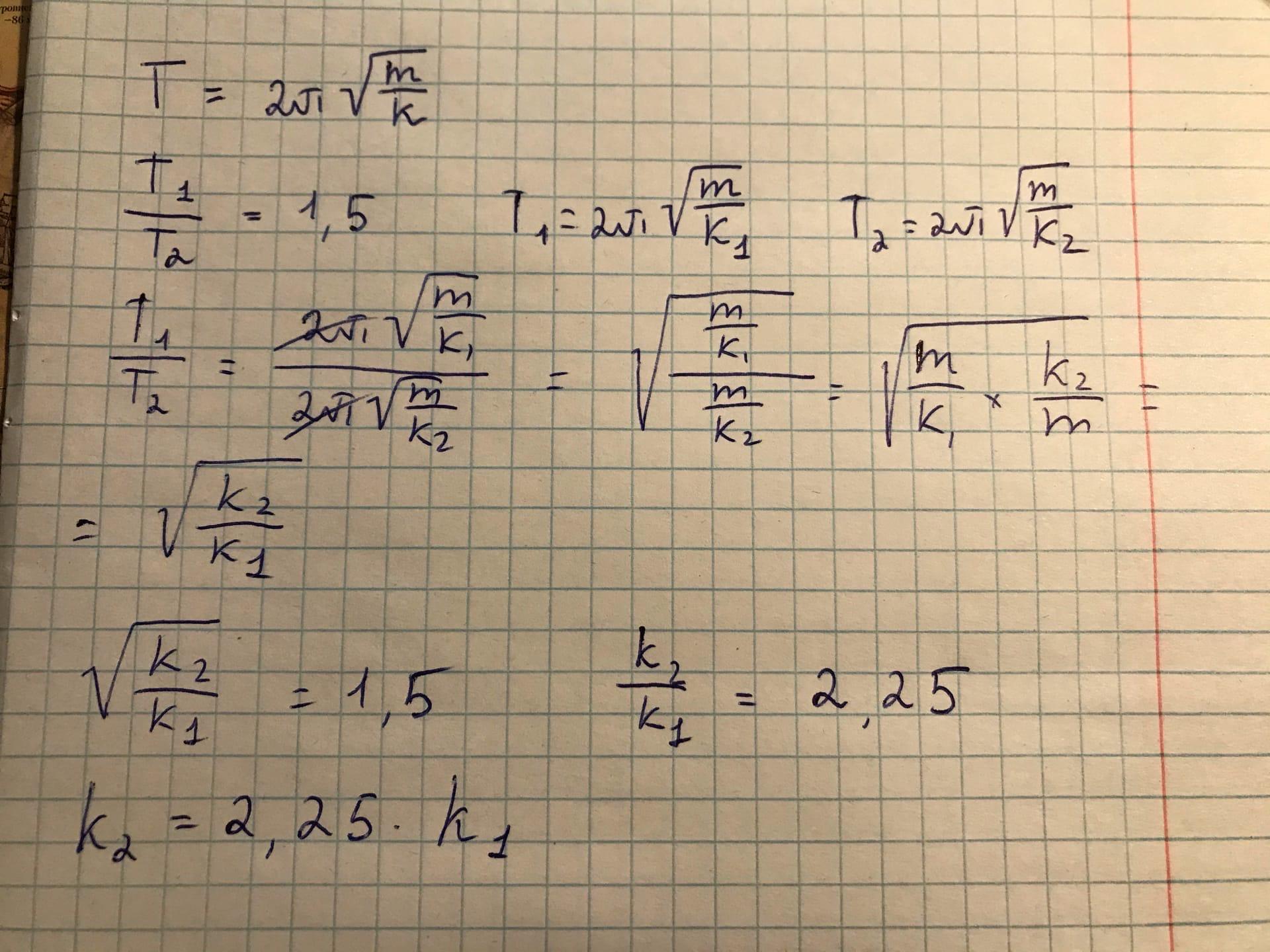 Период колебаний груза, подвешенного на пружине, необходимо уменьшить в 1,5 раз(-а). Определи, во сколько раз нужно увеличить коэффициент жёсткости пружины.