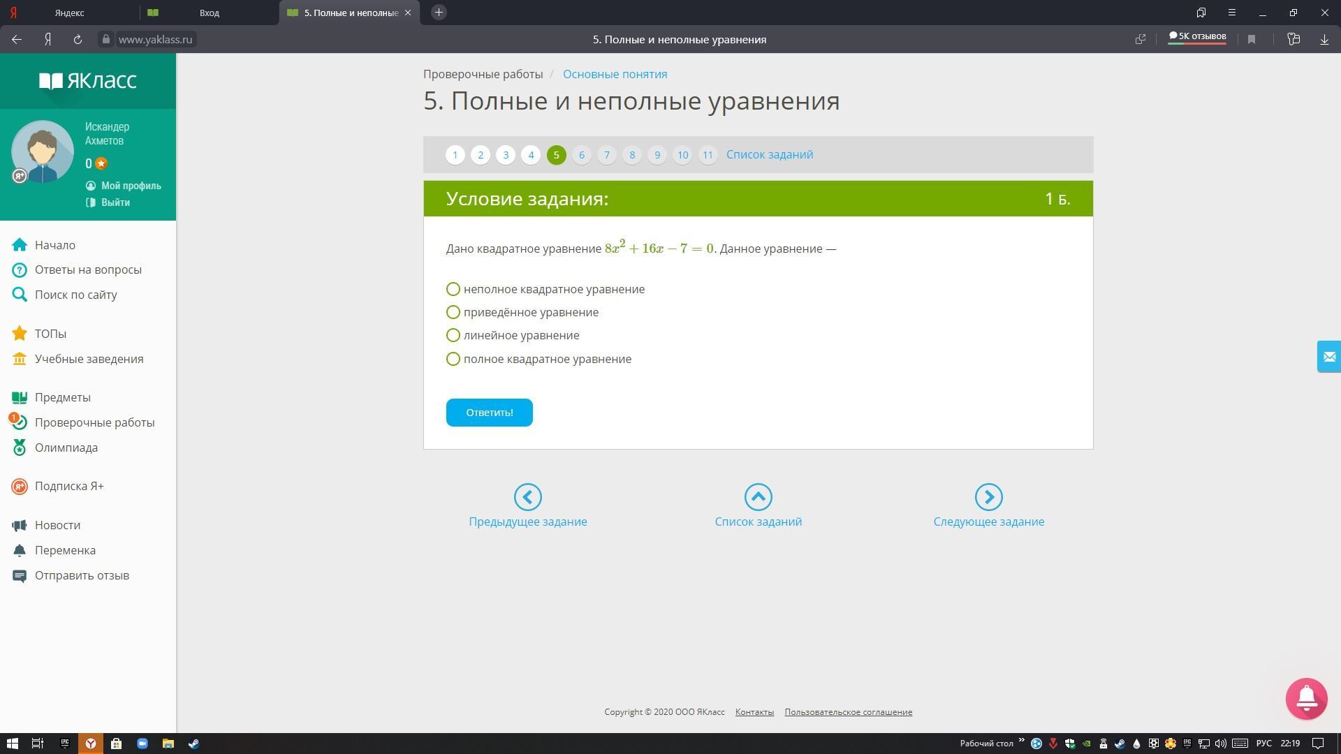 Дано квадратное уравнение 8x2+16x−7=0. Данное уравнение —