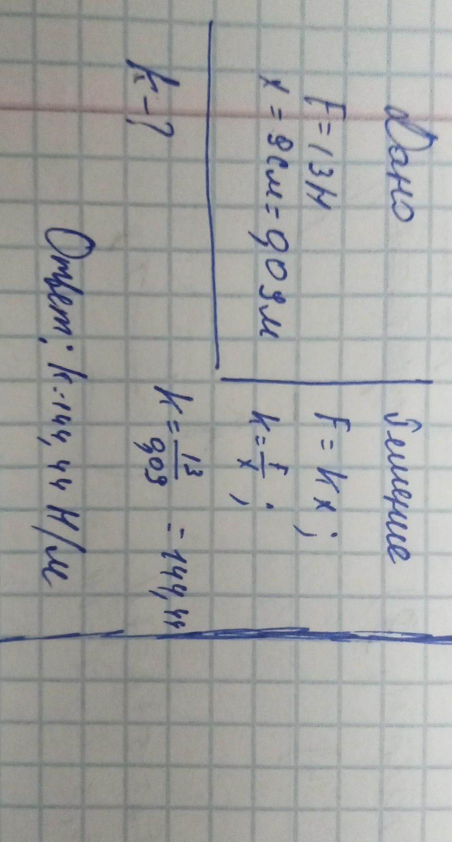 Найди коэффициент жёсткости стальной пружины, которая сжимается на 9 см под действием силы 13 Н.