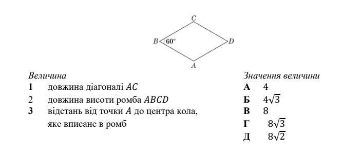 Довжина сторони ромба ABCD дорівнює 8, ∠B = 60°. Установіть відповідність між