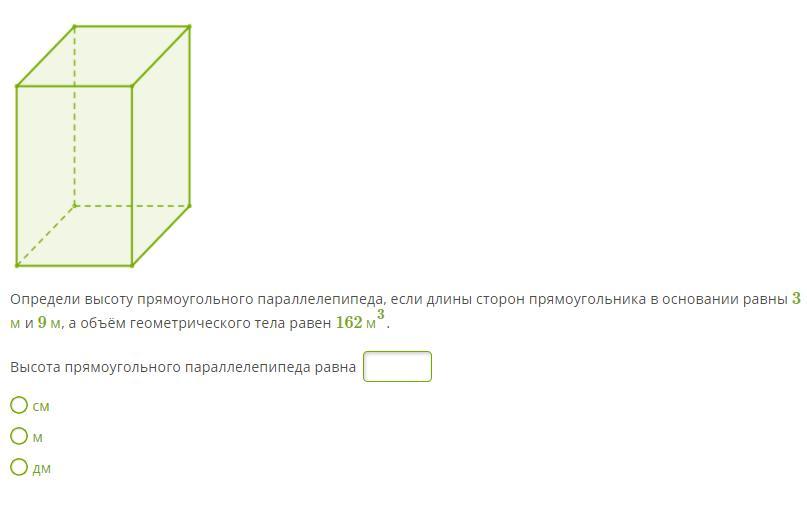 h=V/S. h=162:27=6м=60дм=600см