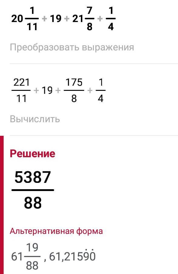 На самом деле тут всё довольно-таки просто. Чтобы из сложной дроби вида 20(1/11) перевести в обычную достаточно 20 умножить на 11 и сложить 1, знаменатель остаётся тот же, то-есть 11: 20×11 =220 и 220+1= 221 -> 221/11. Ну и аналогично с другими дробями. Такие числа, как 19 приводим к виду дроби 19/1, а потом находим общий знаменатель у всех дробей и складываем.