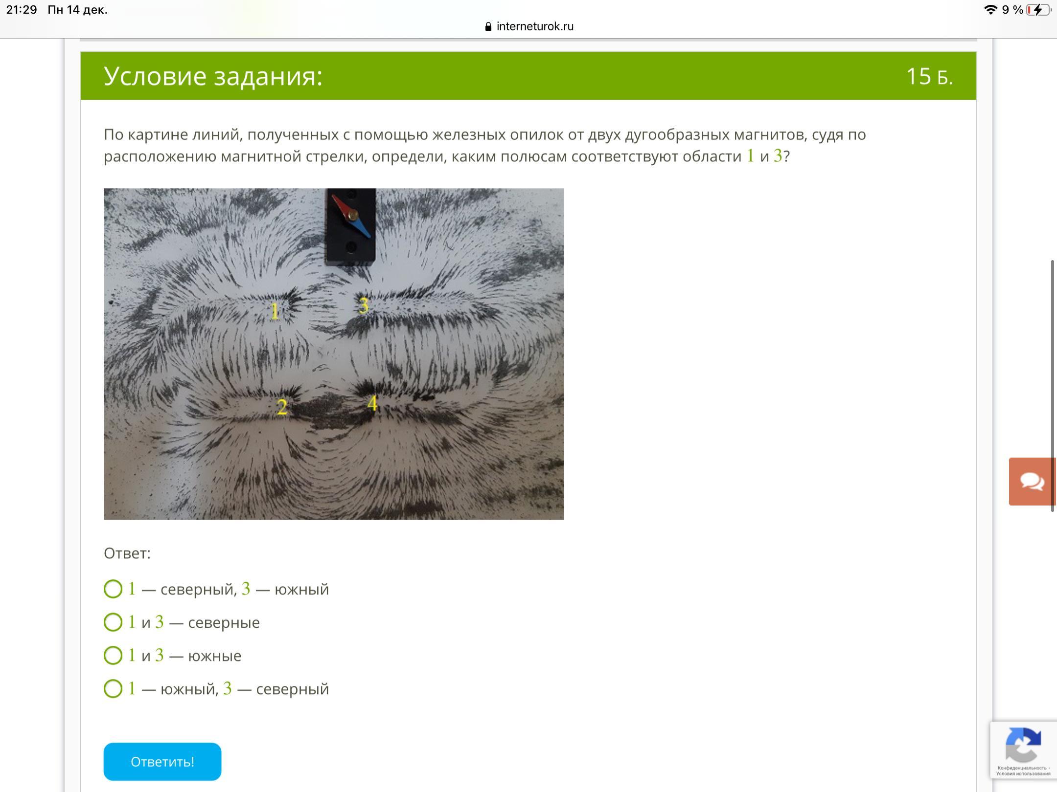 По картине линий, полученных с помощью железных опилок от двух дугообразных магнитов, судя по расположению магнитной стрелки, определи, каким полюсам соответствуют области 1 и 3 ?