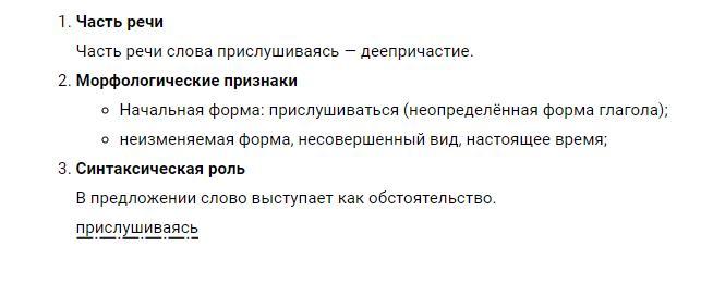 прислушиваяясь: при-приставка, слуш-корень, ива-суффикс, я-суффикс, сь- постфикс, прислушива- основа слова