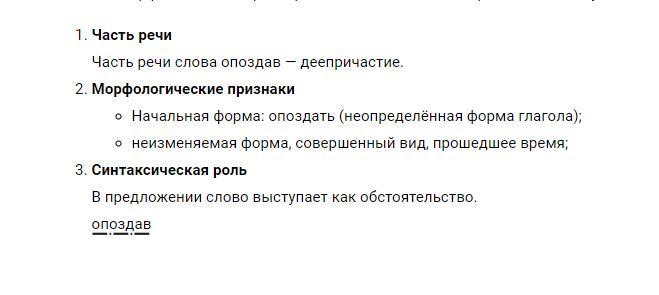 опоздав: о-приставка, позд-корень, а-суфикс, в-суффикс, опозда-основа слова.