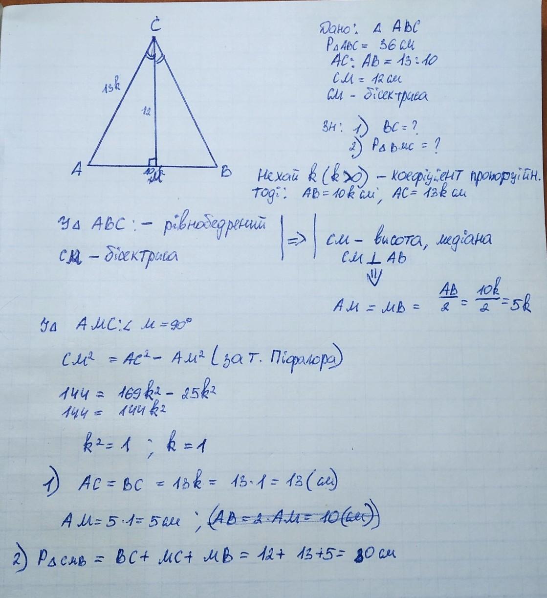 AB-основа рiвнобедренрго трикутника ABC, периметр якого дорiвнює 36 см, AC:AB=13:10. відрізок CM завдовжки 12 см є бісектрисою цього трикутника.