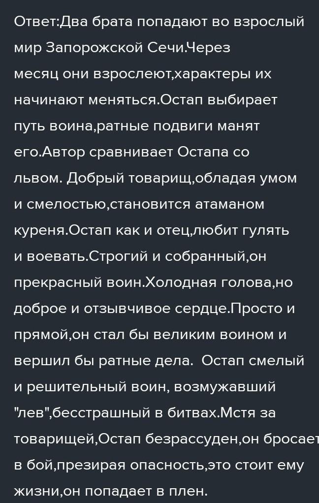 Ответ:Два брата попадают во взрослый мир Запорожской Сечи.Через месяц они взрослеют,характеры их начинают меняться.Остап выбирает путь воина,ратные подвиги манят его.Автор сравнивает Остапа со львом. Добрый товарищ,обладая умом и смелостью,становится атаманом куреня.Остап как и отец,любит гулять и воевать.Строгий и собранный,он прекрасный воин.Холодная голова,но доброе и отзывчивое сердце.Просто и прямой,он стал бы великим воином и вершил бы ратные дела. Остап смелый и решительный воин, возмужавший "лев",бесстрашный в битвах.Мстя за товарищей,Остап безрассуден,он бросается в бой,презирая опасность,это стоит ему жизни,он попадает в плен.