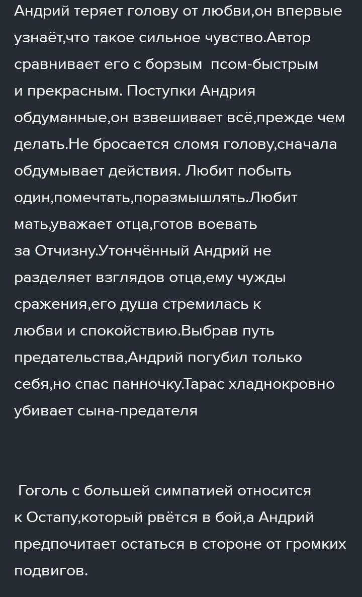 Андрий теряет голову от любви,он впервые узнаёт,что такое сильное чувство.Автор сравнивает его с борзым псом-быстрым и прекрасным. Поступки Андрия обдуманные,он взвешивает всё,прежде чем делать.Не бросается сломя голову,сначала обдумывает действия. Любит побыть один,помечтать,поразмышлять.Любит мать,уважает отца,готов воевать за Отчизну.Утончённый Андрий не разделяет взглядов отца,ему чужды сражения,его душа стремилась к любви и спокойствию.Выбрав путь предательства,Андрий погубил только себя,но спас панночку.Тарас хладнокровно убивает сына-предателя