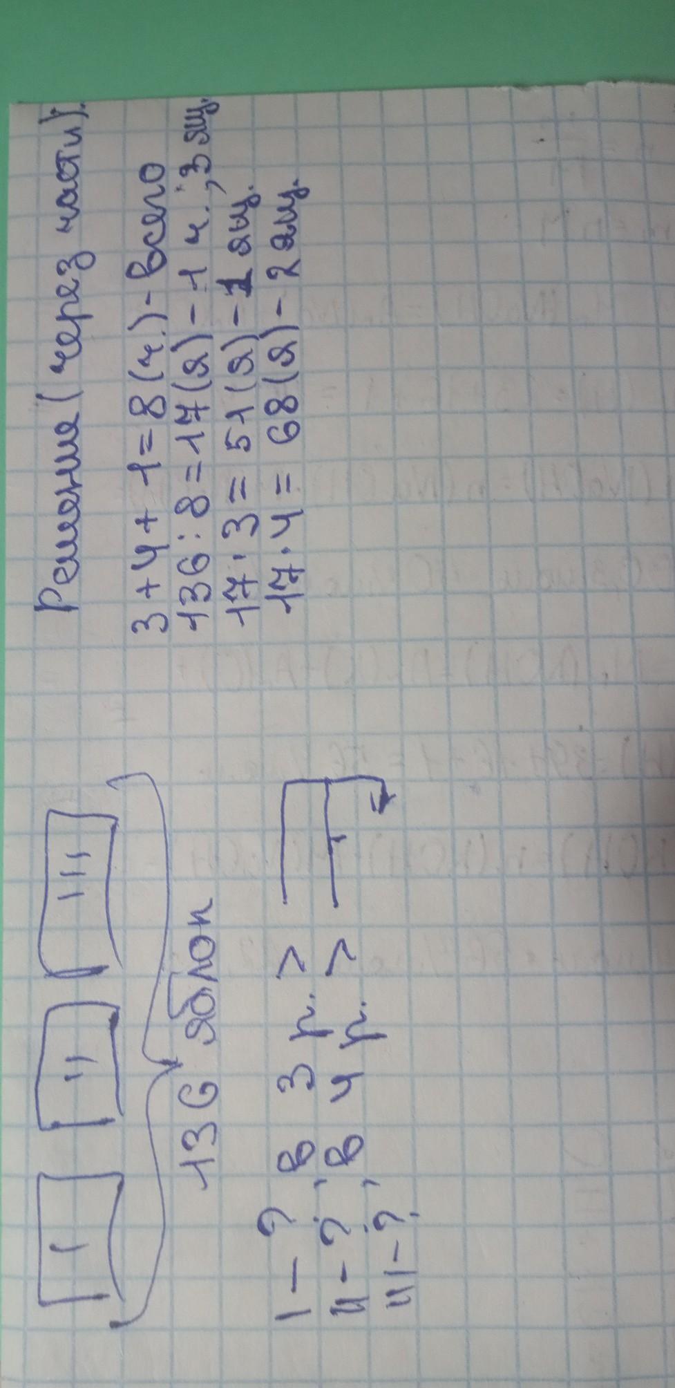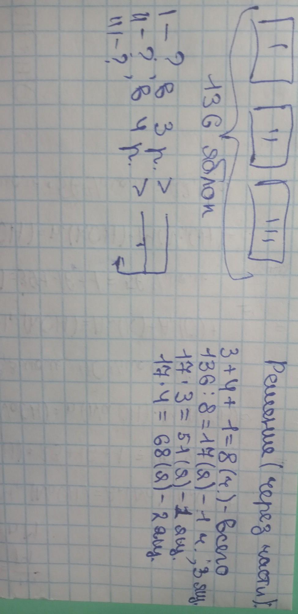 В трех ящиках 136 кг яблок. Сколько яблок в каждом ящике, если в первом ящике в 3 раза больше яблок, чем в третьем, а во втором – в 4 раза больше, чем в третьем?