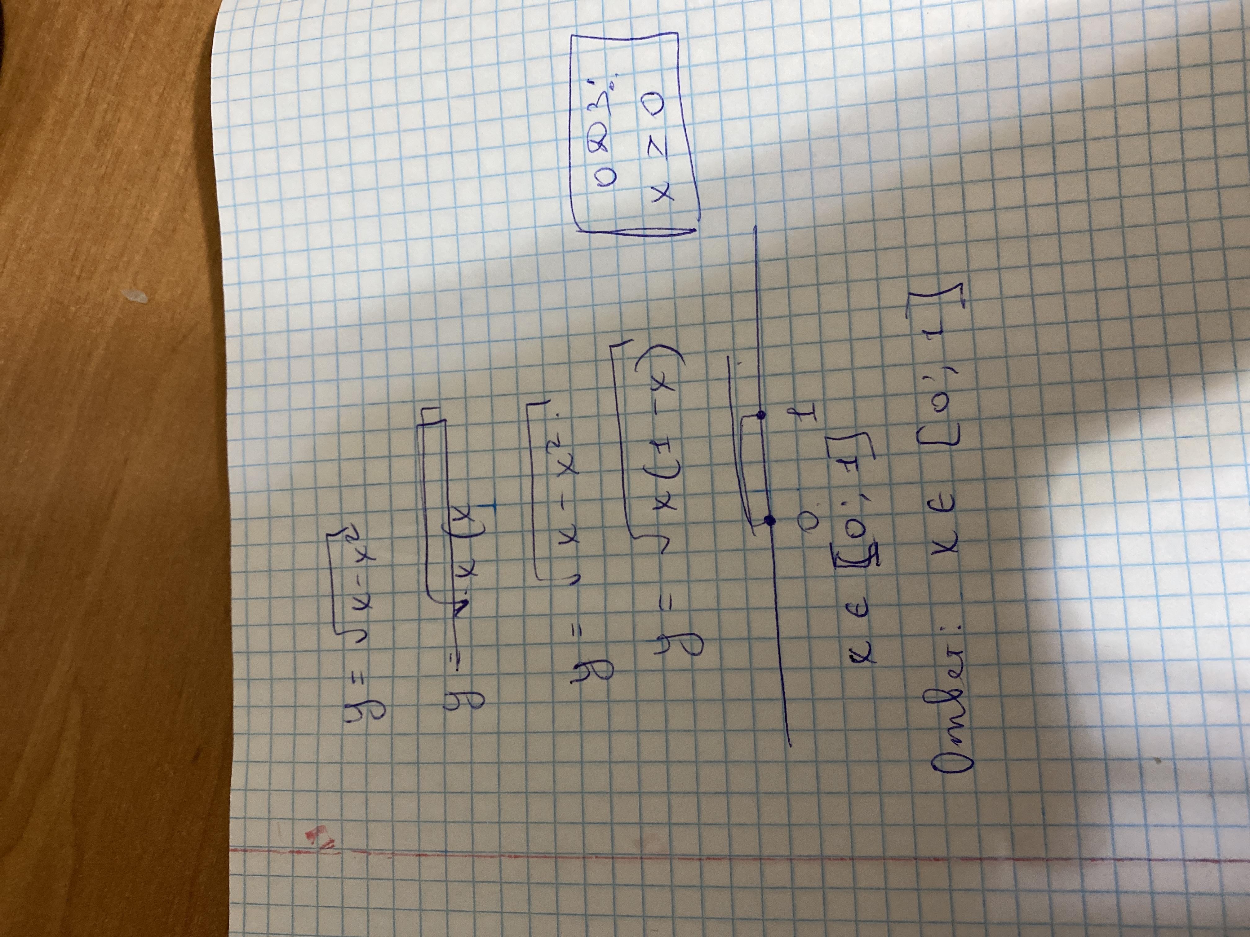 Найдем область определения функции у = √(х - х ^ 2). Областью определения функции является выражение из под корня больше или равно 0. То есть получаем: x - x ^ 2 > = 0; - x ^ 2 + x > = 0; - x * (x - 1) > = 0; { x = 0; x - 1 = 0; Известные значения переносим на одну сторону, а неизвестные на другую сторону.