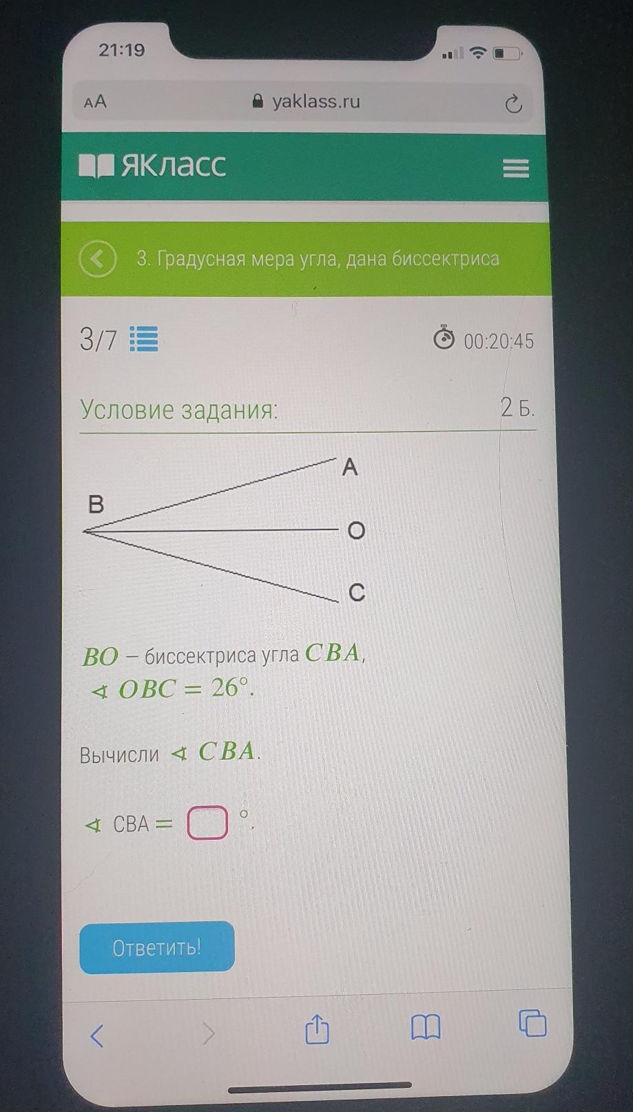 Биссектриса делит угол пополам, это значит угол OBA=OBC, из этого получается угол OBC=26 °.