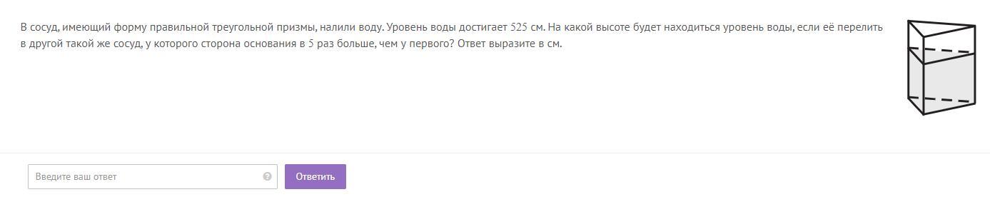 Сторона основания в 5 раз больше, значит площадь основания в 25 раз больше, значит высота уменьшится в 25 раз. 525 / 25 = 21.