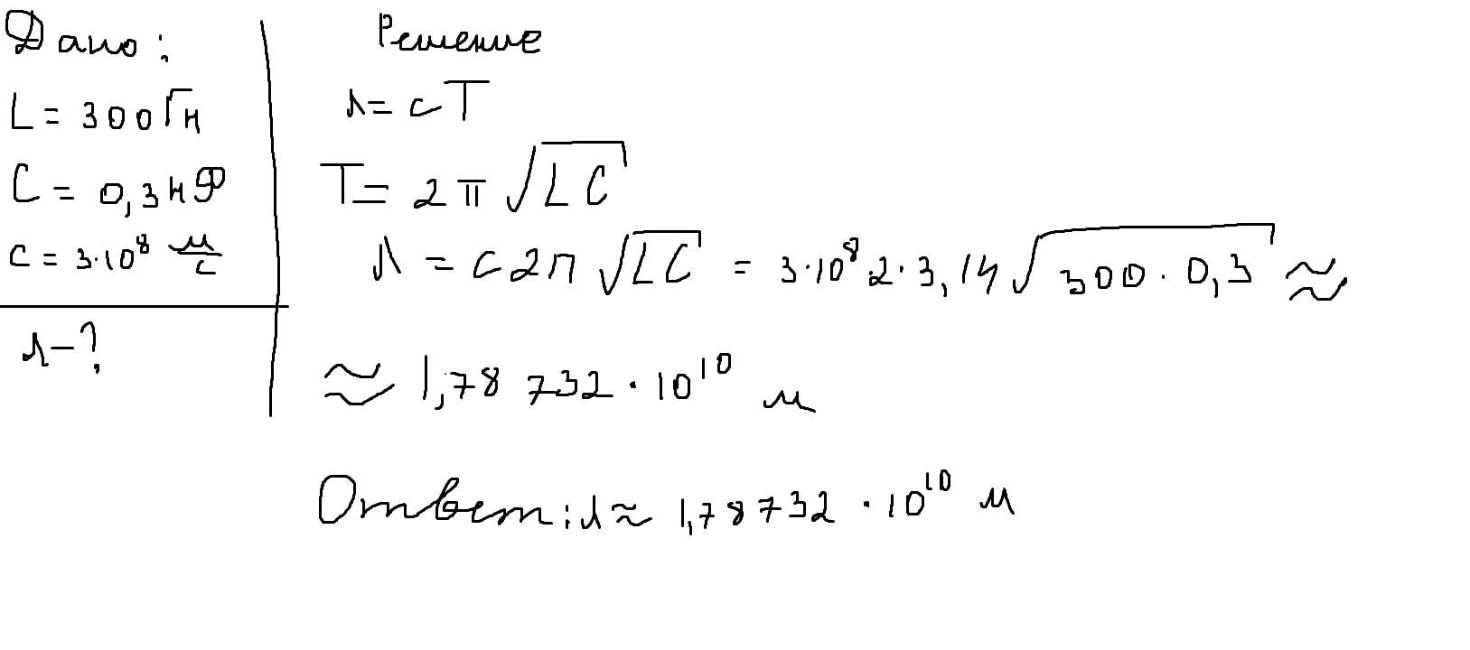 Определить длину электромагнитных волн в воздухе, излучаемых колебательным контуром емкостью 0,3 нФ и индуктивностью 300 Гн.