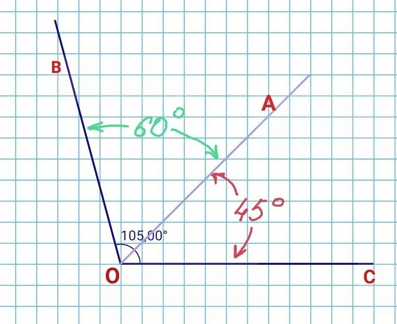 с) ∠АОВ = 60º, ∠АОС = 45º, ∠ВОС = 105º