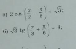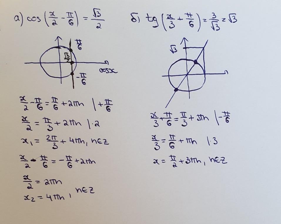 а) рисуем окружность, находим ось cosx и по ней отмечаем числовые значение (корень из 3)/2 (просто рисуем вертикальную линию). Если знаете таблицу синусов-косинусов углов в 30/45/60, то вспомните, что (корень из 3)/2 - это 30 градусов. и все: то, что в скобочка приравниваем к найденным углам (сначала П/6, потом -П/6).
