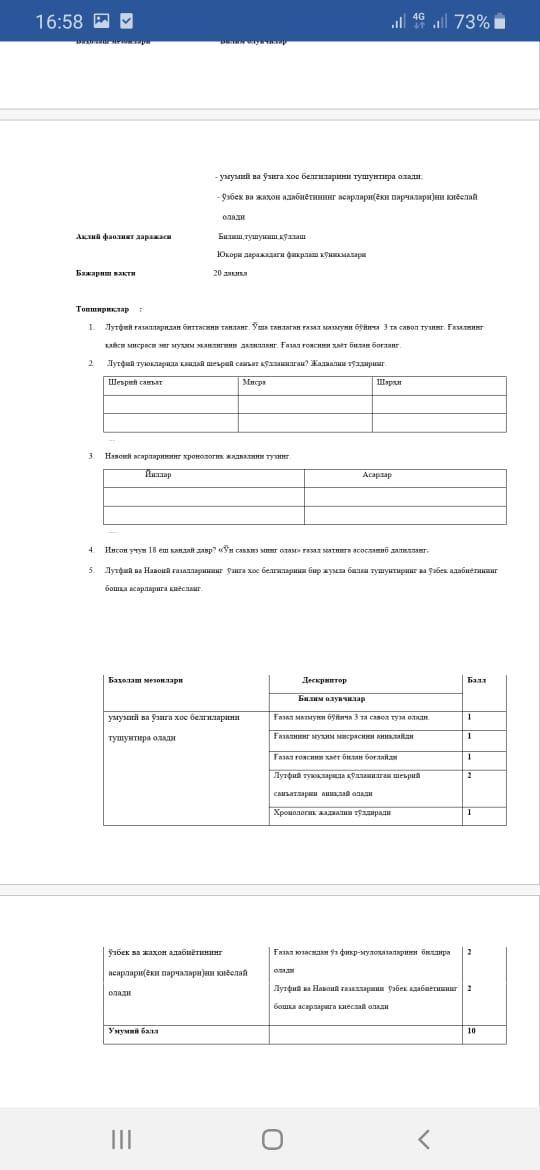 Помогите на сор узбекого летеретуры . Iltimos uzbek adabiyotdan sor bajarishga yordam bervoringlarchi . Foto mengayam shunaqa ģuvor keldi