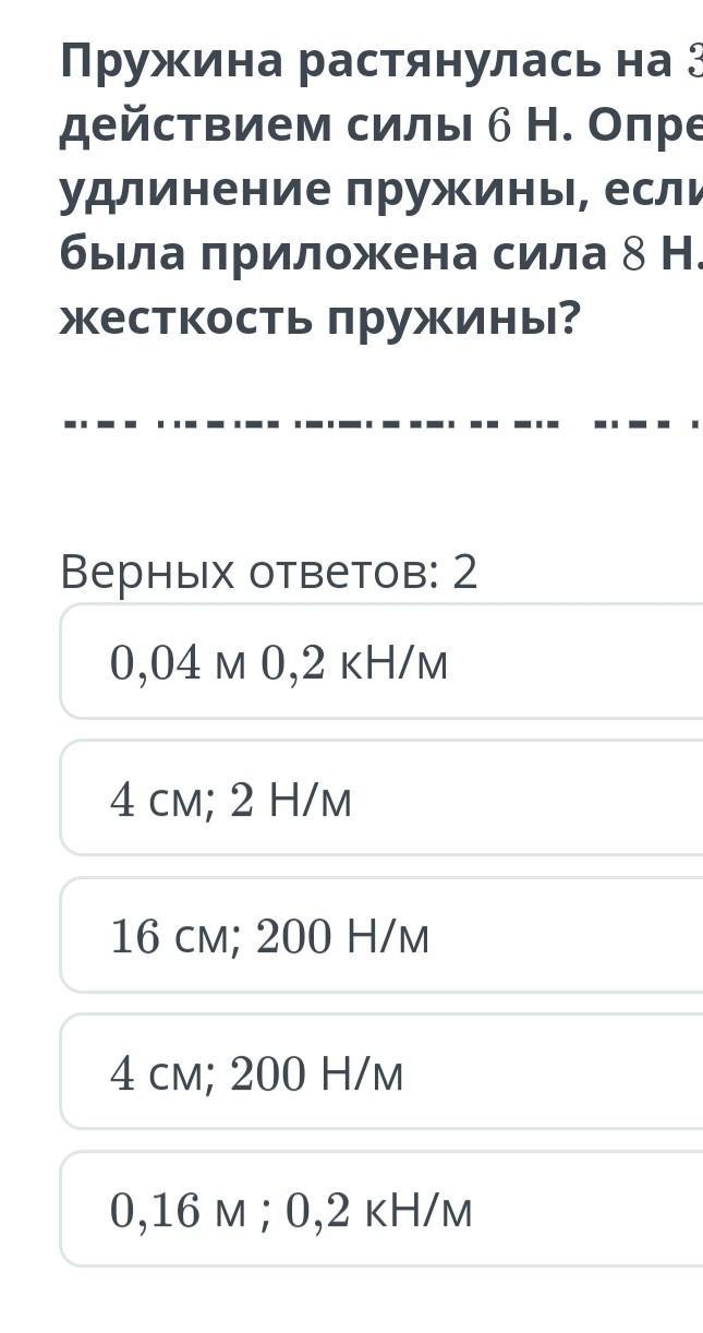 Пружина растянулась на 3 см под действием силы 6 H. Определи удлинение пружины, если бы к пружине была приложена сила 8 H. Какова жесткость к пружине?