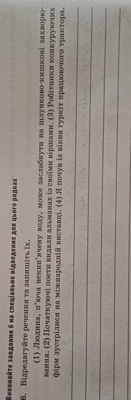 Ответ: 1. Людина, яка п'є некип'ячену воду, може заслабнути на шлунково-кишкові захворювання. 2. Поети-початківці видали альманах із своїми віршами. 3. Робітники фірм, які конкурують, зустрілися на міжнародній виставці. 4. Я почув із вікна гуркіт роботи трактора.