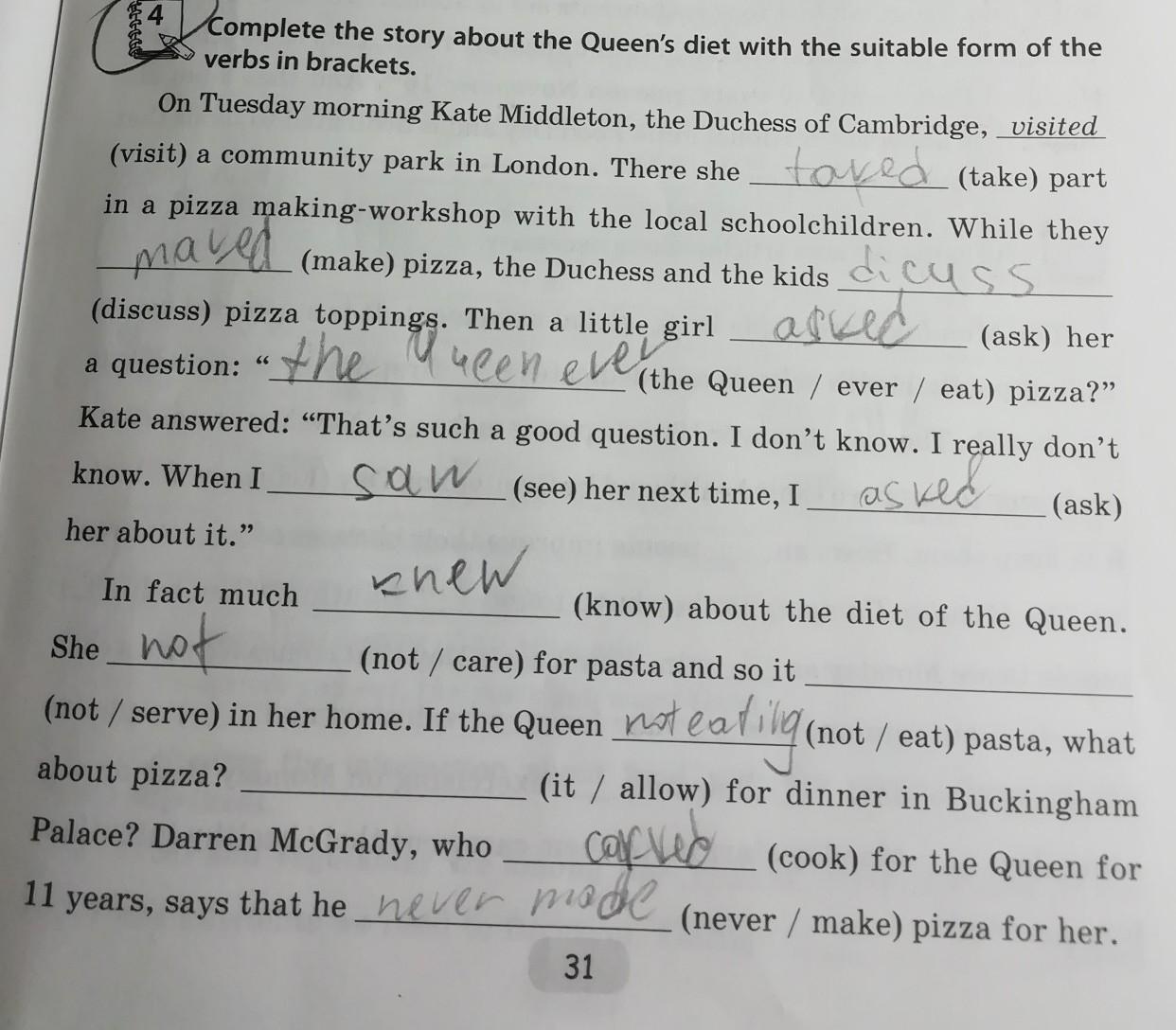 Якщо в минулому часі то ось; She took,made pizza,disscussed,asked,The Queen ever ate,saw,asked,knew,didn't care,didn't serve,didn't eat,cooked,never made (чим змогла допомогла)