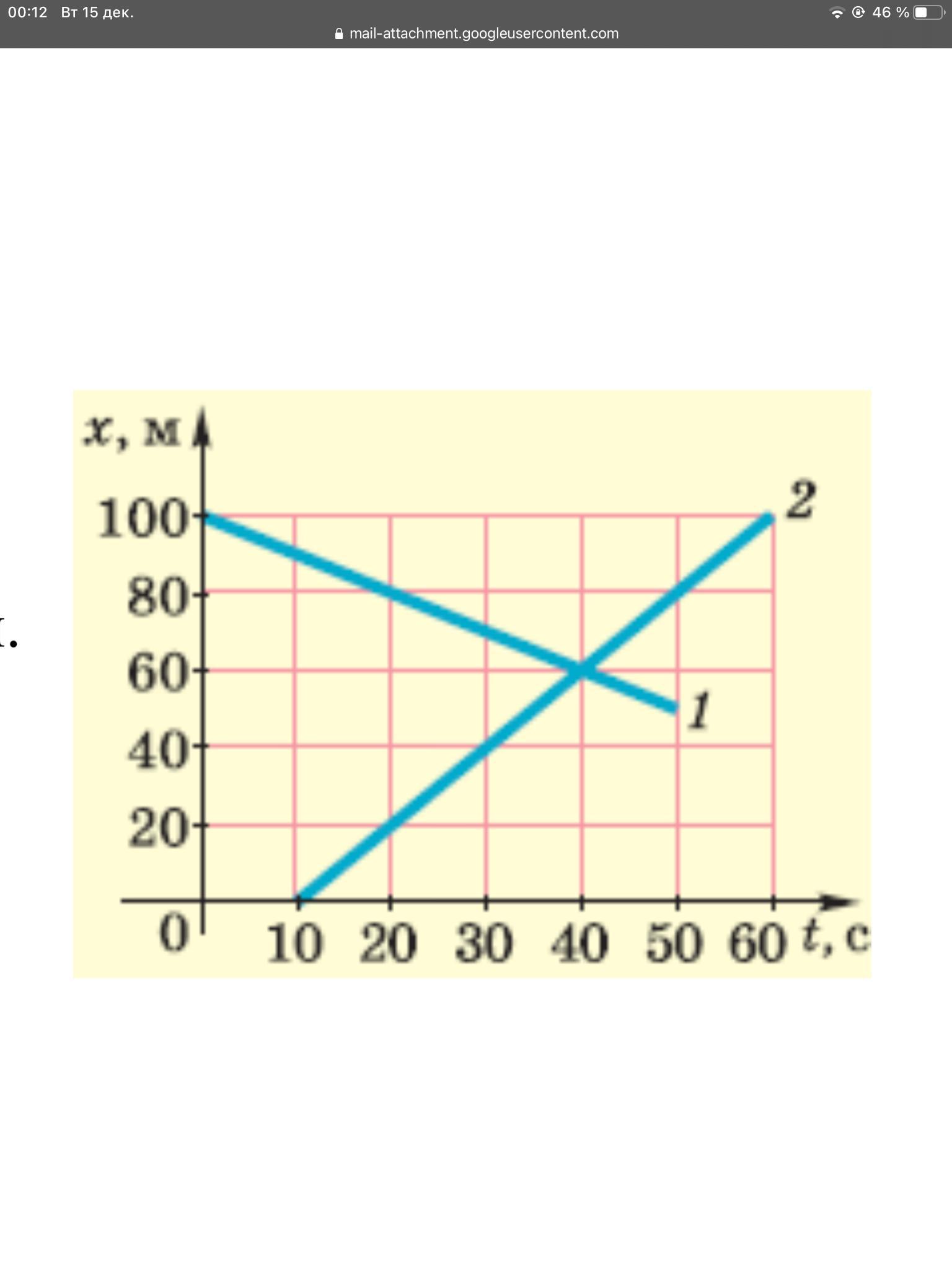 Итак. Для начала вычислим скорость первого тела. Для этого возьмем небольшое расстояние, которое прошло тело и время, за которое оно было пройдено. Например по графику я вижу, что координата тела изменилась со ста до восьмидесяти за двадцать секунд. Далее с помощи ф-лы V(скорость)=(x(конечная координата) - x0(начальная координата))/t(время)
