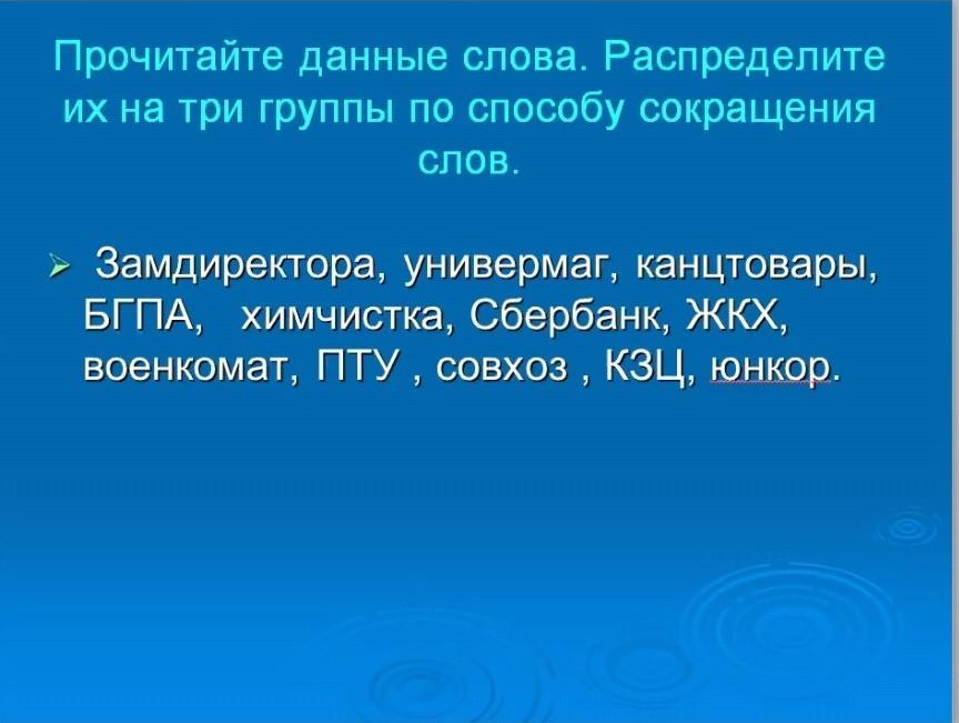 аббревиатуры, состоящие из сочетания начальной части слова с целым словом : замдиректора, универмаг, Сбербанк, химчистка