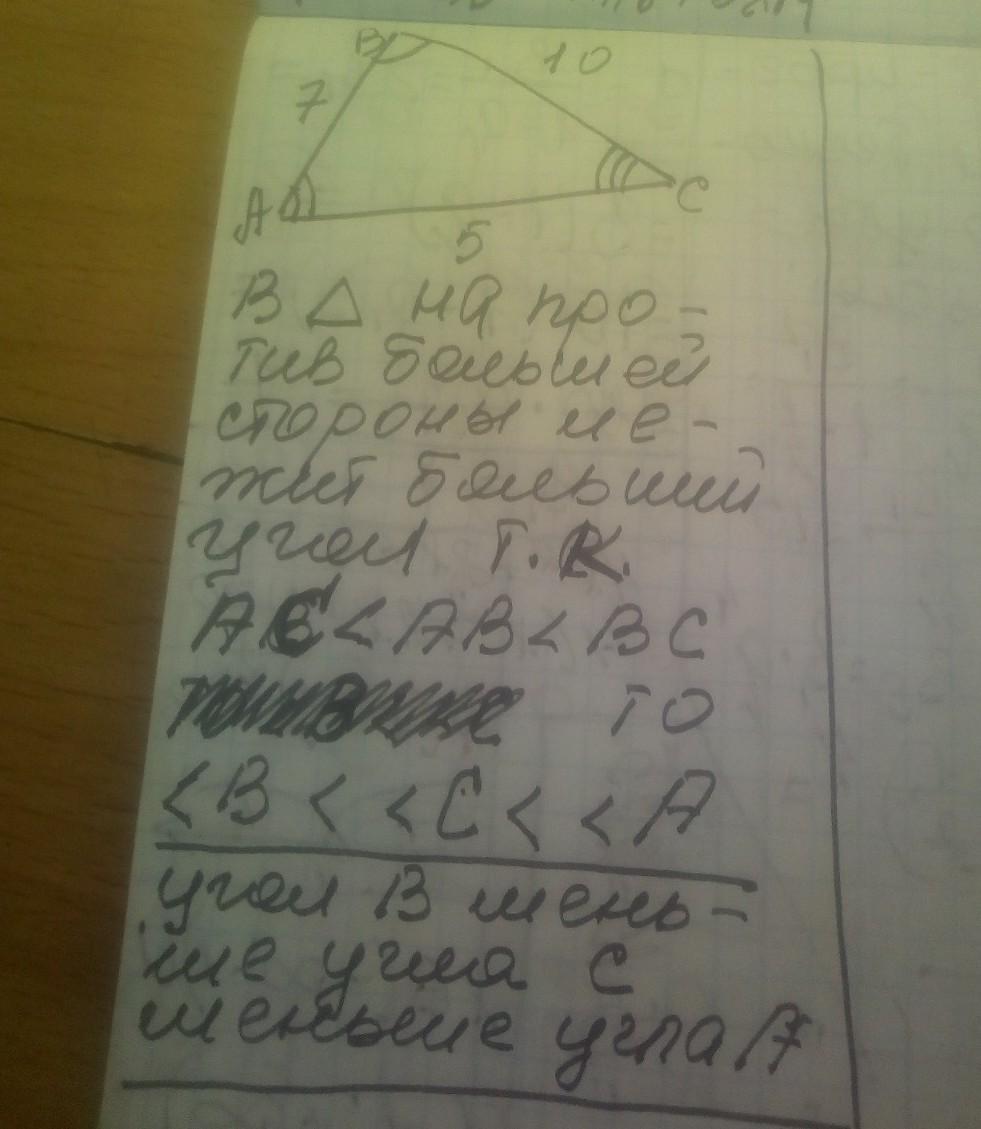 Сравните углы треугольника ABC если AB равно 7 см BC равно 10 см и AC равно 5 см
