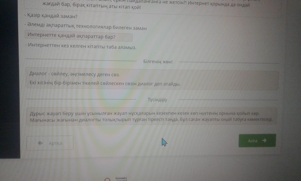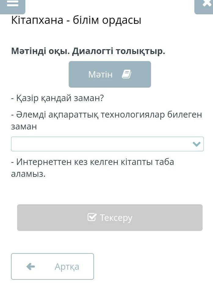 Мәтінді оқы. Диалогті толықтыр.Адамзат баласына керекті рухани байлықтың бәрі кітаптан табылады. Кітап білімнің қайнар бастауы болып саналады. Ал осы кітапты сақтайтын, жинақтайтын, оны оқырманына жеткізетін қасиетті орын – кітапхана. «Адамға ауа қандай қажет болса, кітапхана да сондай қажет» деген көрнекті жазушы Оралхан Бөкей. Бұл сөз кітапхананың өмірдегі орнын дәл айқындап тұр.