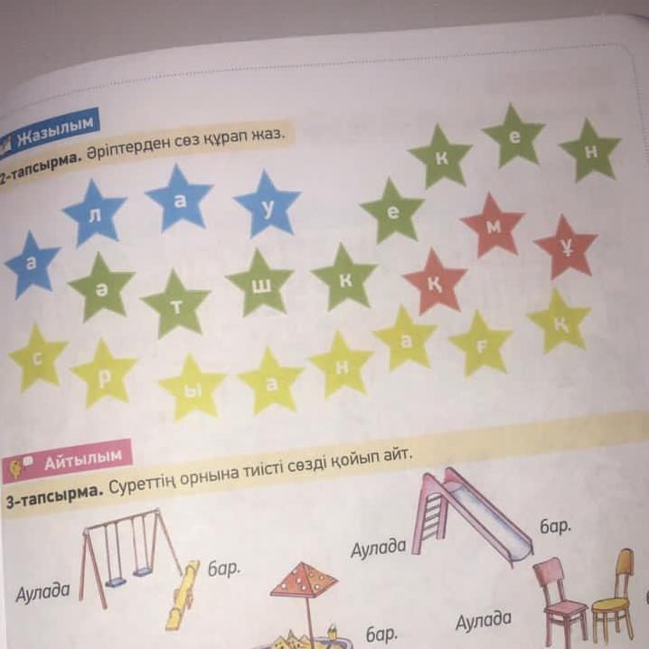 Аула, әткеншек, құм, сырғанақ.