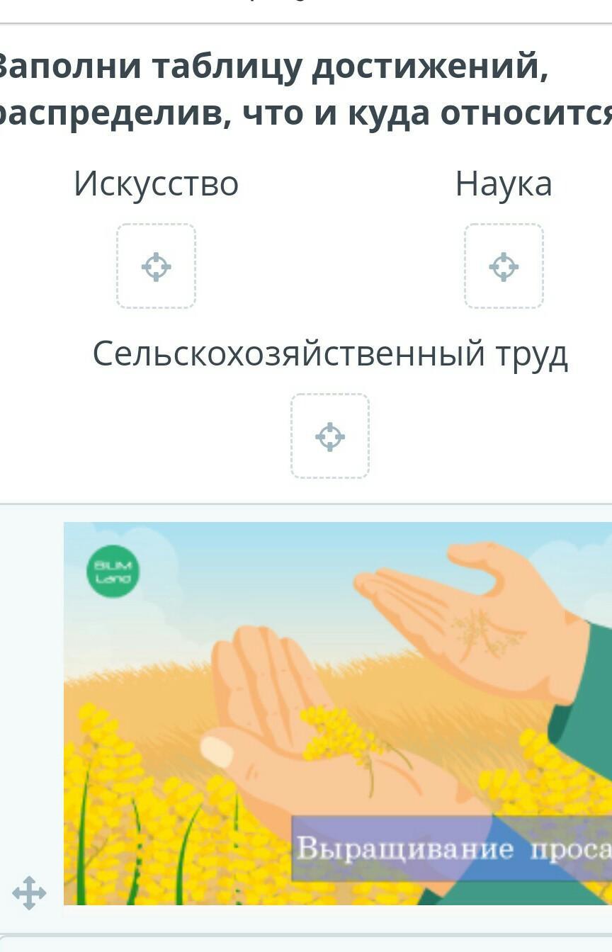 Заполни таблицу достижений, распредели в что и куда относится. Искусство, наука, сельскогохозяйственый труд. СРОЧНО!