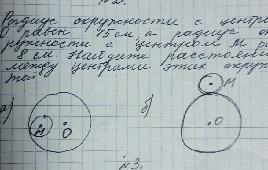 Радиус окружности с центром 0 равен 15 см, а радиус окружности с центром М равен 8 см. Найдите расстояние между центрами этих окружностей.