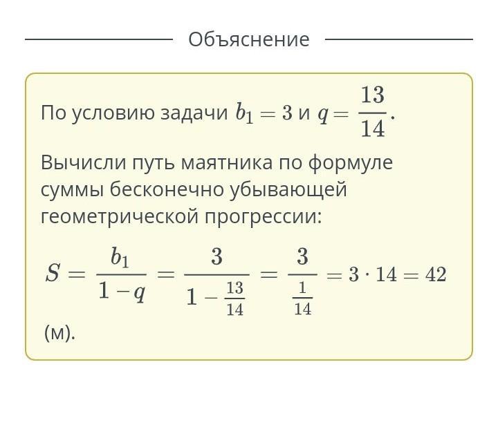 Маятник проходит расстояние 3 м на первом цикле колебания. При каждом следующем колебании проходит 13/14 части расстояния предыдущего колебания. Какой путь пройдет маятник до того как он остановится?