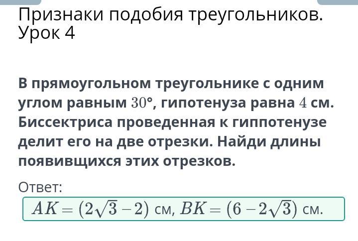 В прямоугольном треугольнике с одним уголом равным 30 градусов , гипотенуза равна 4 см . Биссектриса проведенная к гипотенузе делит его на две отрезки . Найдите длины появившихся отрезков .