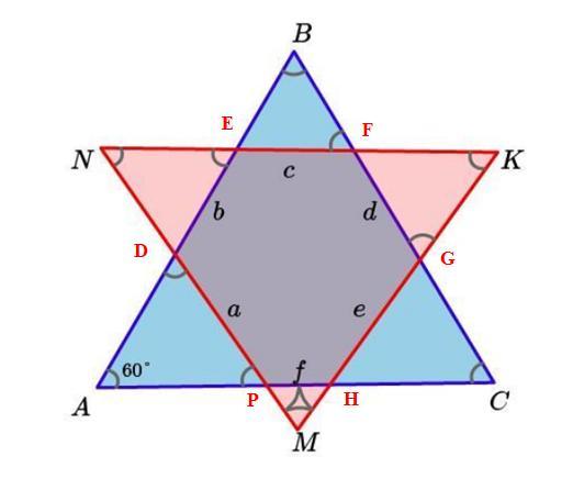 Шестиугольник со сторонами a, b, c, d, e, f образован пересечением двух равносторонних треугольников с периметрами PABC = 18 см и PMNK = 15 см, как показано на рисунке. Известно, что AB ∥ MK, BC ∥ MN, AC ∥ NK, и все указанные углы равны. Найди периметр шестиугольника. Ответ: P = см.
