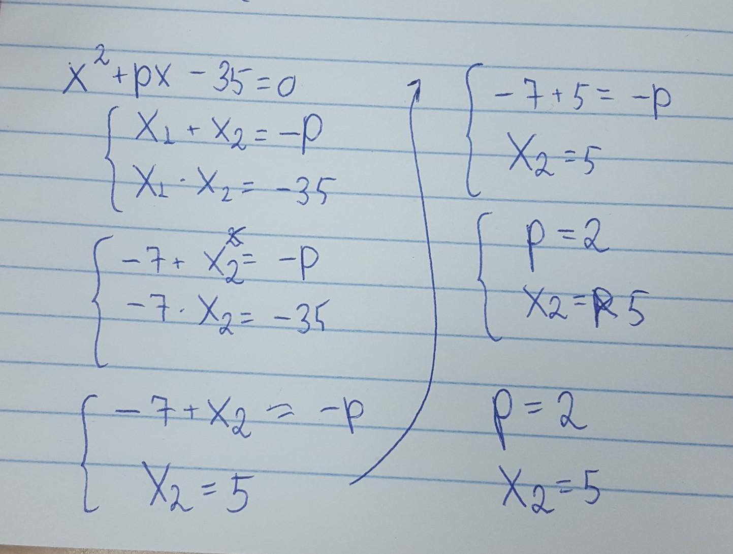 Число -7 является корнем уравнения x^2+px-35=0, найдите второй корень уравнения и значение p, используя теорему Виета.