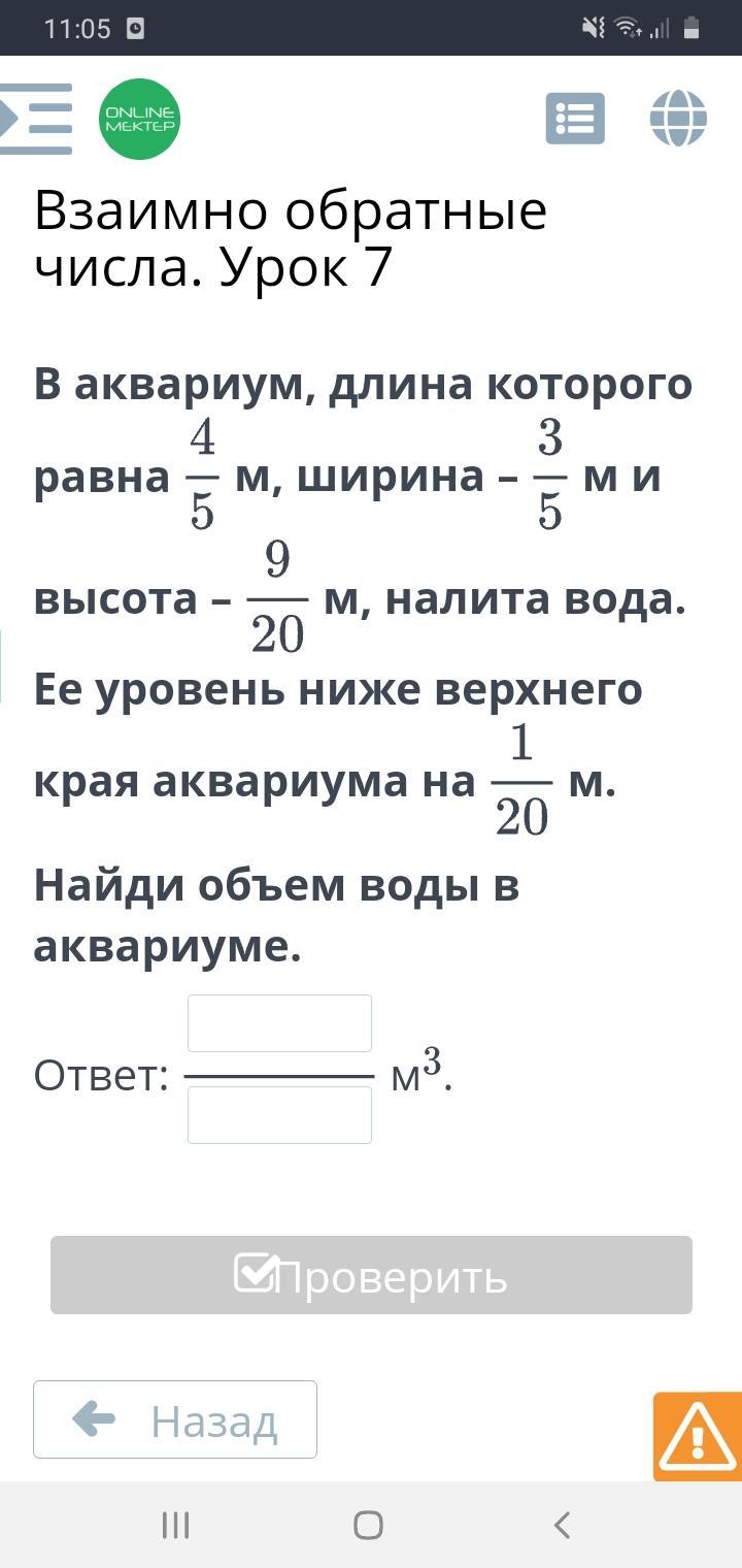 если уровень воды ниже верхнего края аквариума на 1/20 м, то уровень воды = 9/20 - 1/20 = 8/20 = 2/5 м