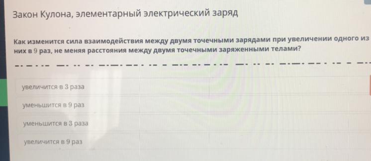 Онлайн мектеп. Закон Кулона,элементарный электрический заряд. Как изменится сила взаимодействия между двумя точечными зарядами при увеличении одного из них в 9 раз, не меняя расстояния между двумя точечными заряженными телами?