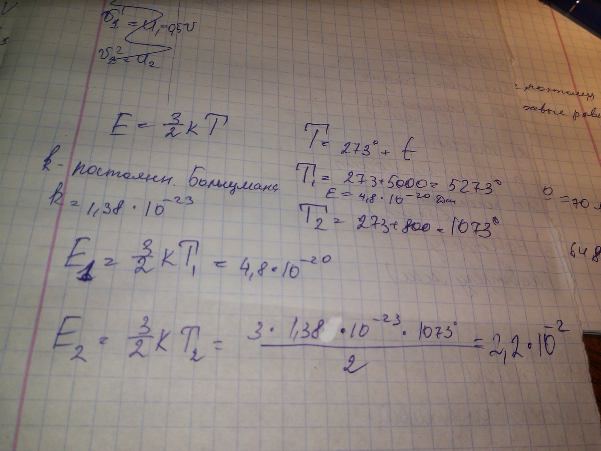 Средняя кинетическая энергия поступательного движения молекул газа при температуре 5000 градусов по Цельсию равна 4,8*10^(-20) Дж. Какова эта энергия при температуре 800 градусов по Цельсию? Решите задачу))