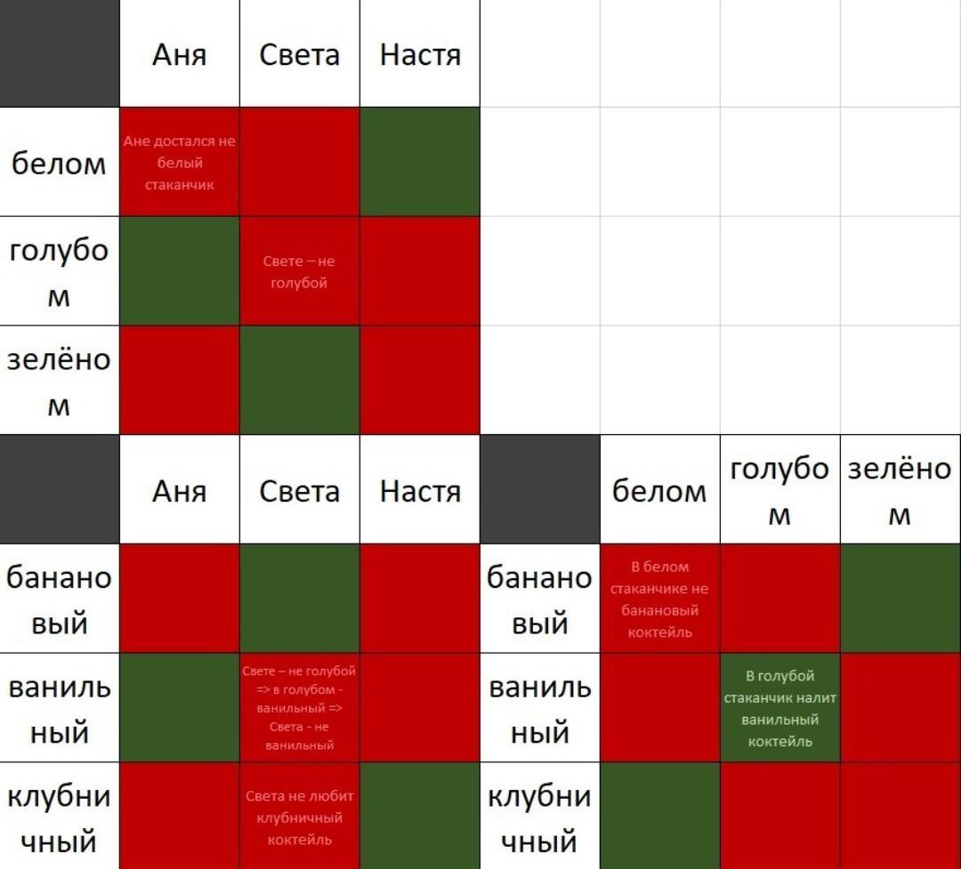 Три подружки - Аня, Света и Настя - купили различные молочные коктейли в белом, голубом и зеленом стаканчиках. Ане достался не белый стаканчик, а Свете - не голубой. В белом стаканчике не банановый коктейль . В голубой стаканчик налит ванильный коктейль. Света не любит клубничный коктейль. Определите содержимое каждого из трёх стаканчиков, а также какой коктейль выбрала каждая девочка. Составьте таблицу истинности.(Последнее условие наиболее важно)