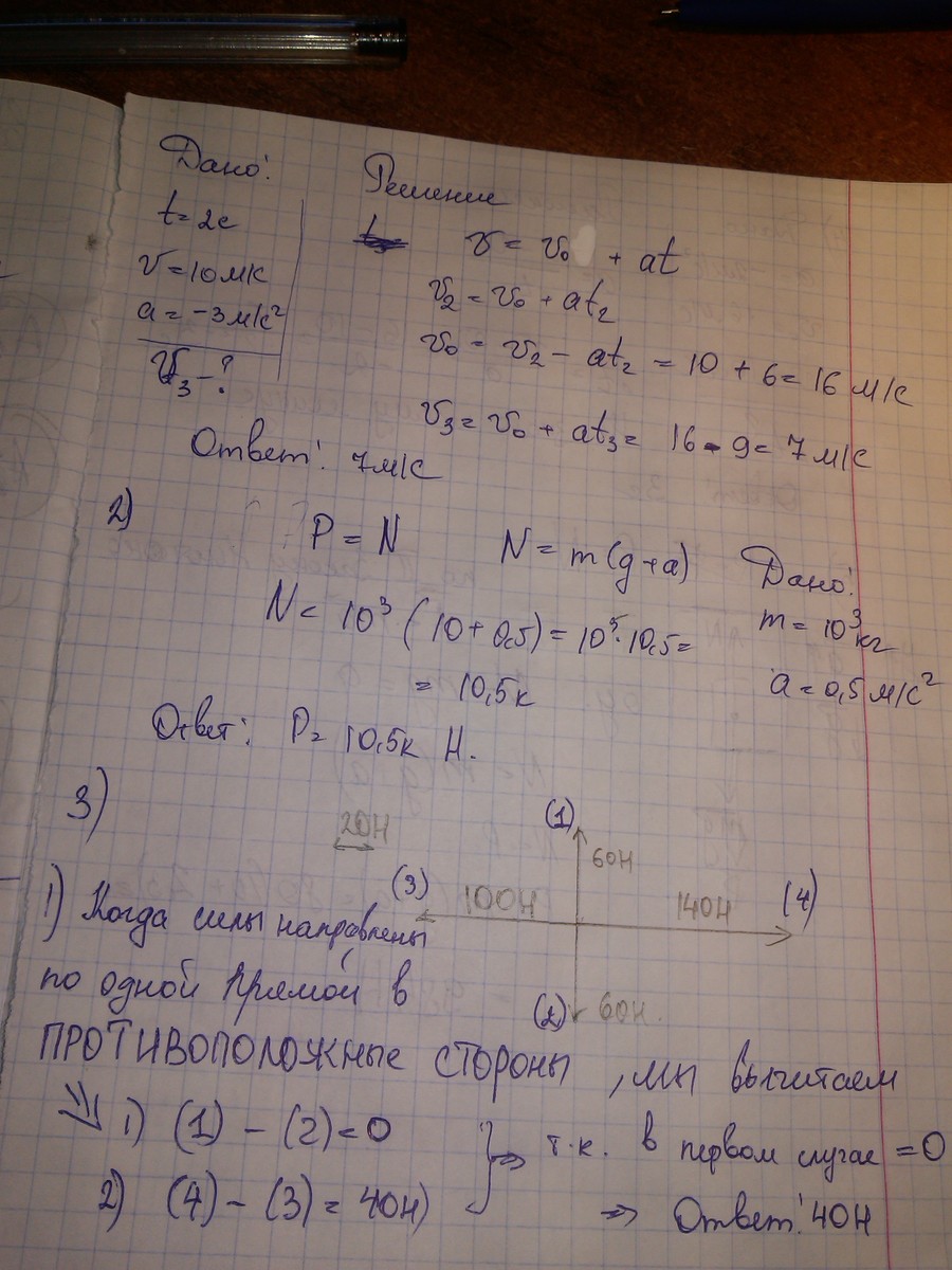 1.тело движется 2с со скоростью 10м/с и ускорением -3м/с^2 .Определите скорость тела в конце третьей секунды