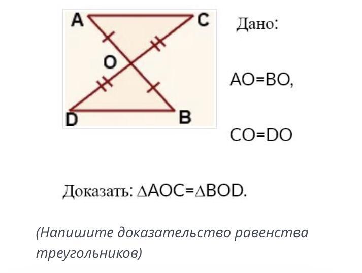 А C Дано: AO = BO , CO = DO Доказать: Delta*A * O * C = Delta*B * O * D . (Напишите доказательство равенства треугольников) В