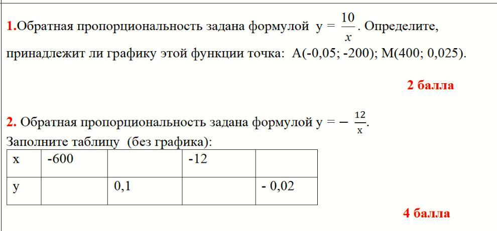 1. Обратная пропорциональность задана формулой у =10/x . Определите, принадлежит ли графику этой функции точка: А(-0,05; -200); М(400; 0,025).