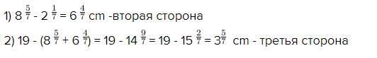Длина одной стороны треугольника равна 7 3/5 см длина второй стороны на 2 1/5 меньше длины первой стороны. Найдите длину третьей стороны треугольника, если периметр треуголоника равен 15 см