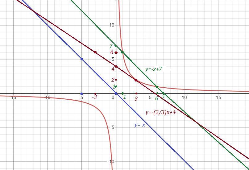 б) Прямая, имеющая две точки пересечения, имеет, например, уравнение . Она пересекает гиперболу в точках (0,7) и (7,0) .