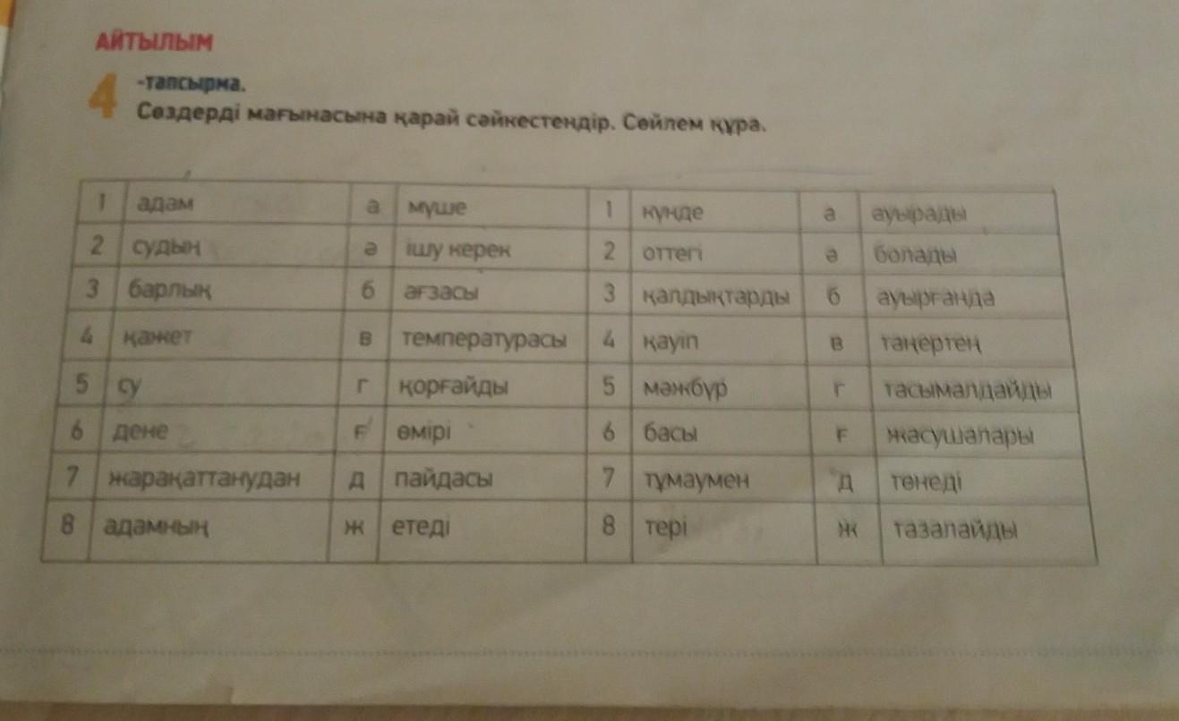 Сөздерді мағынасына қарай сәйкестендір.Сөйлем құра