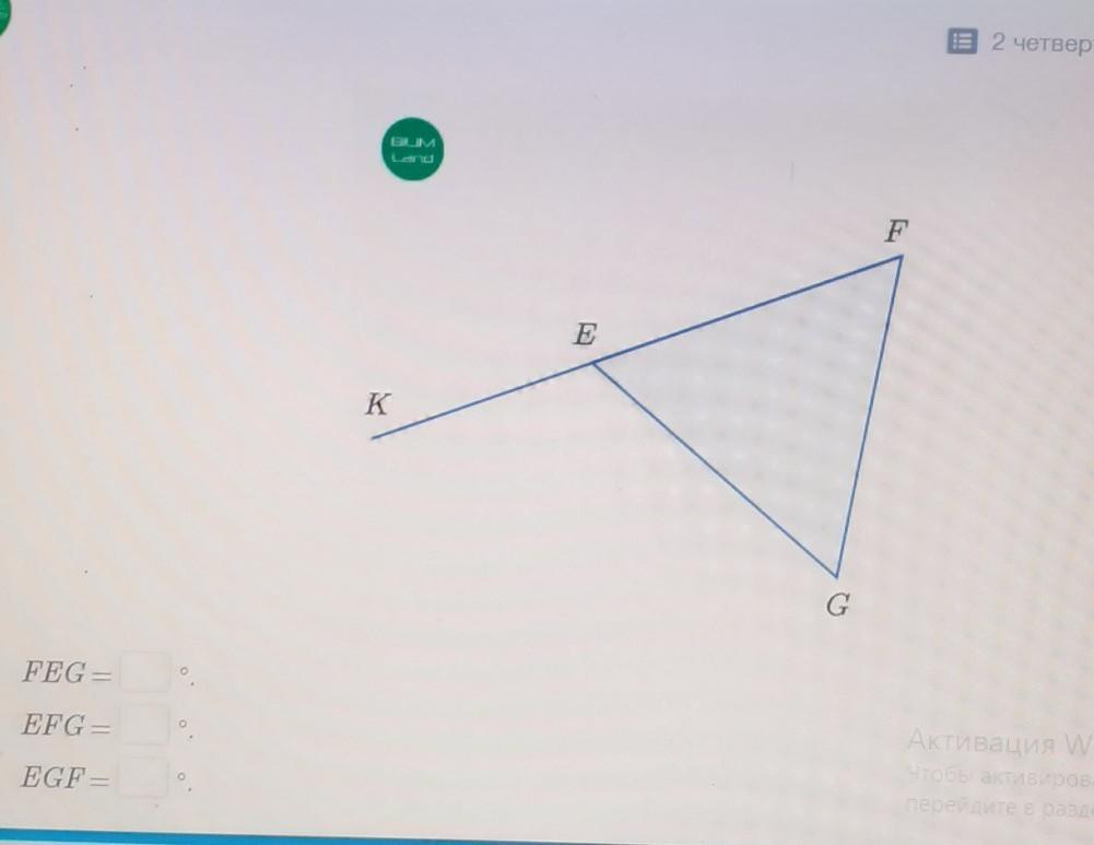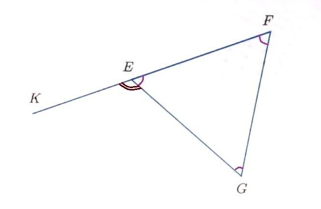 На рисунке сторона FE равностороннего треугольника EFG продолжена. Угол KEG больше угла FEG на 60 градусов. Найдите углы треугольника EFG