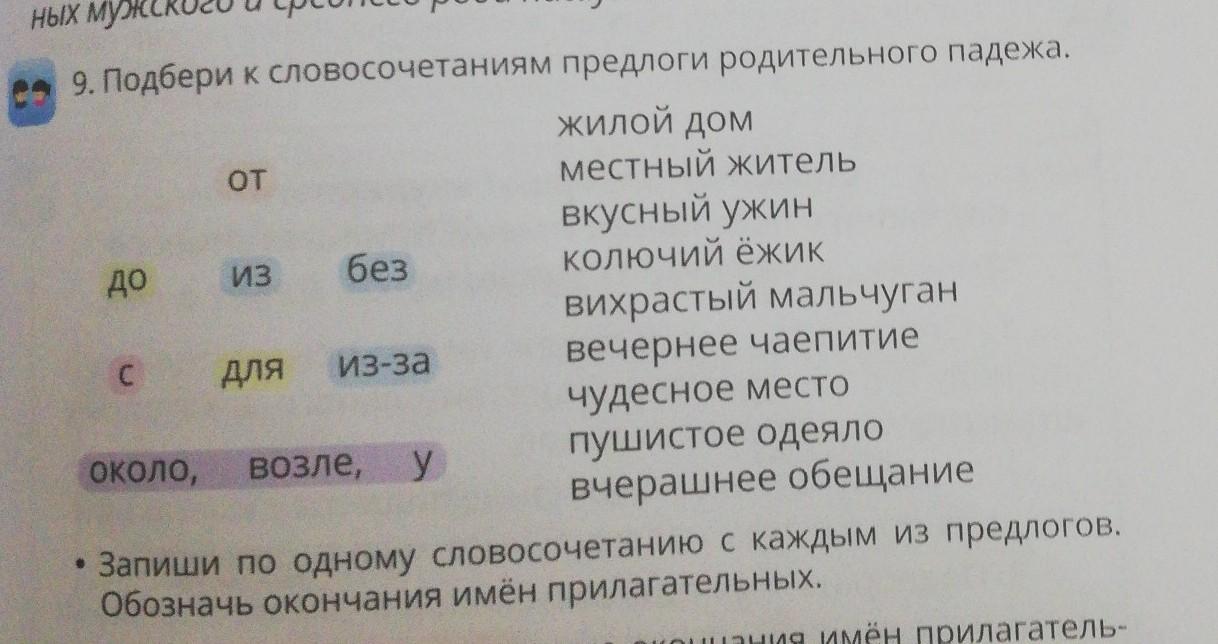 9. Подбери К словосочетаниям предлоги родительного падежа.