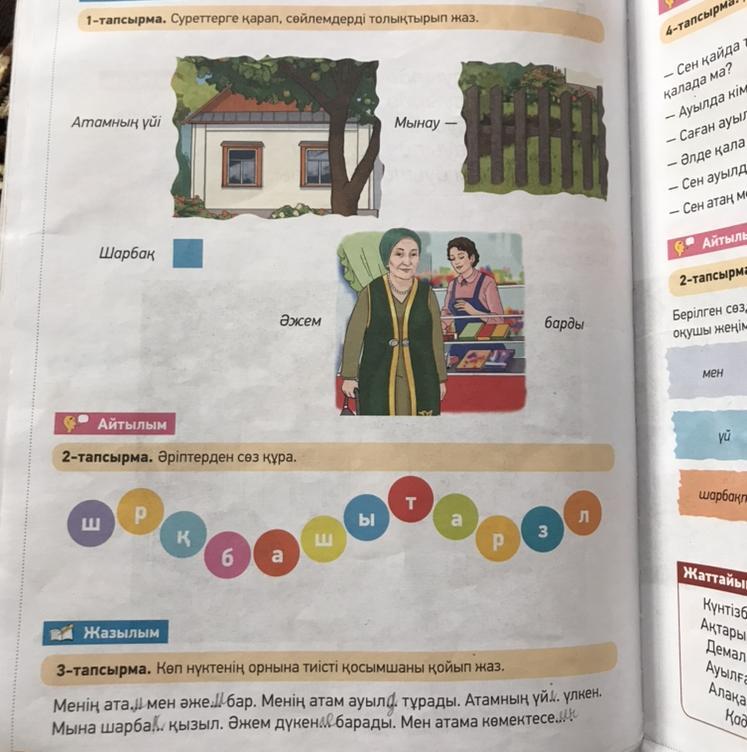 срставить предложения по картинки.Атамның үйі үлкен. Мынау-шарбақ.Әжем дүкенге барады.