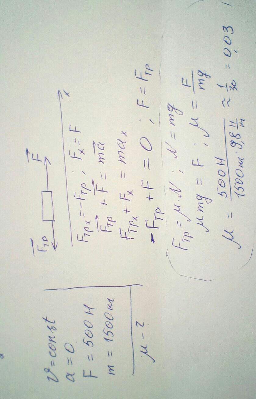 По дороге едет автомобиль с постоянной скоростью m=1500кг, сила тяги f=500H. Найдете коэффициент трения?