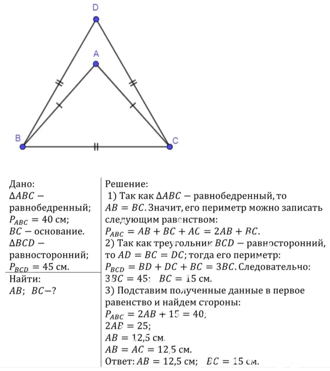 даю 72 балла токо правильно пж Периметр равнобедренного треугольника АВС с основанием ВС равен 60 см, а периметрравносторонниго треугольника ВCD равен 45 см.Найдите стороны АВ и ВС